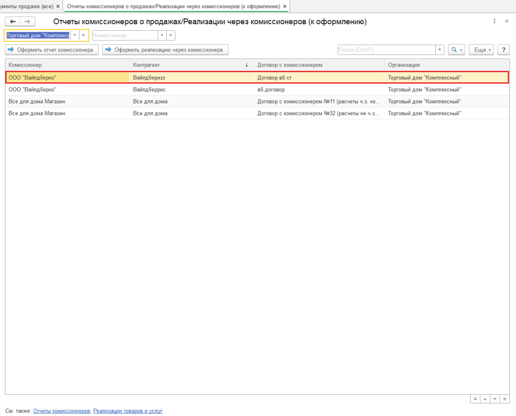 Далее отражаем отчет комиссионера по данным, которые отправляет маркетплейс. В пункте «Документы продажи(все)» выбираем «Отчеты комиссионеров/реализаций через комиссионеров».
