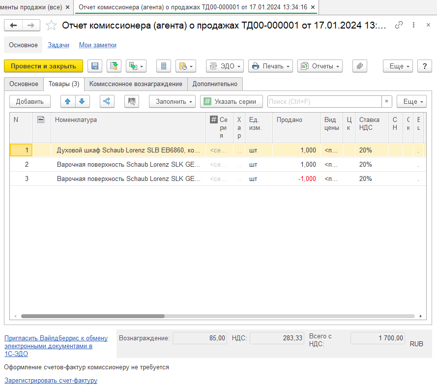 После первоначального заполнения отразим товары, по которым прислал информацию маркетплейс. Важно обратить внимание, что возврат товара покупателем отражается в отчете комиссионера со знаком «-» в продано с соответствующим количеством. В данном примере продажа и возврат происходили в одном отчетном периоде. Если же возврат произошел позже, то такие данные отражаются в отчете будущих периодов.