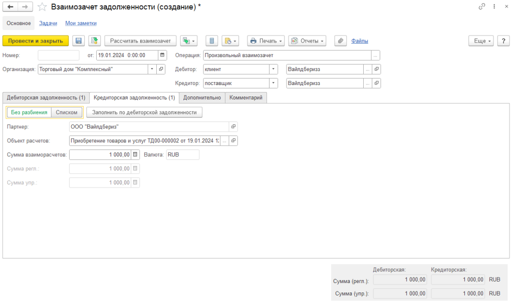 Чтобы произошел взаимозачет по суммам по разным соглашениям, используем «Взаимозачеты задолженности». Перейдем в «Казначейство» - «Взаимозачеты задолженности» и создадим документ. В открывшемся документе укажем кредитора как «Клиент» и дебитора как «Поставщик», а конкретно - маркетплейс, с которым работали ранее. Значения в дебиторской и кредиторской задолженности должны быть равны. Для взаимозачетов выбираем наименьшее значение между отчетом комиссионера и приобретением услуг.